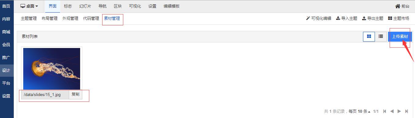 蝉知4.3beta版本开始,提供素材库功能,上传的图片保存到素材库里,也可以从素材库里提取自己所需的图片。