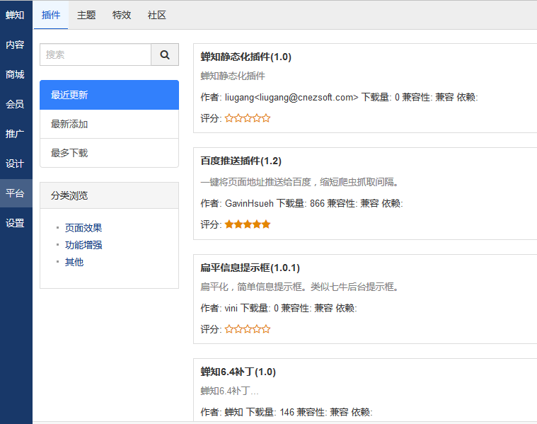 蝉知后台→平台→扩展里,目前主要是查看和管理插件。蝉知目前的插件比较少,后期将会逐步开发完善起来。