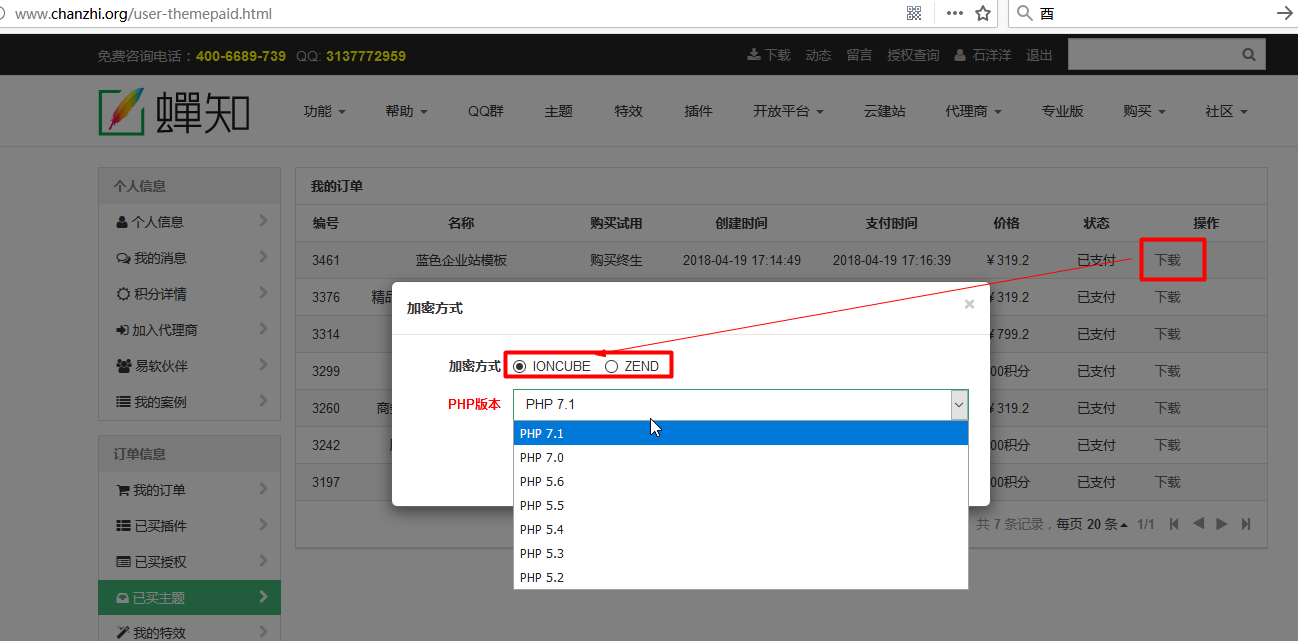 2、付款后可以在 http://www.zsite.com/user-themepaid.html 查看已买的主题, 根据 蝉知环境选择ioncube 或者 zend加密方式( 虚拟主机服务器(空间)用户如果不清楚可以咨询一下服务器提供商,如果使用的是蝉知xampp一键安装包,默认已经内置了ioncube,如果之前没有安装过任何的解密程序,建议安装ioncube: http://www.zsite.com/book/chanzhieps/189.html ),并选择蝉知所处环境的php版本然后进行下载。