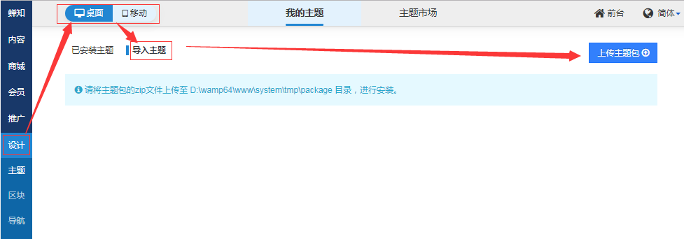 3、网页登录蝉知 后台-设计-模式(桌面还是移动,根据主题的设备信息进行选择)-导入主题-上传主题包 点击右上角的 上传主题包按钮进行导入。如果系统开启了文件安全校验,会提示在指定目录创建指定txt文件进行验证,按照提示操作即可。