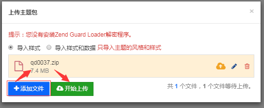 4、根据提示创建文件后上传下载的主题zip包( 注意:插件的zip名称不能随意修改,只能使用默认的 qd0037.zip 这种格式,不能使用 qd0037(1).zip这种命名)