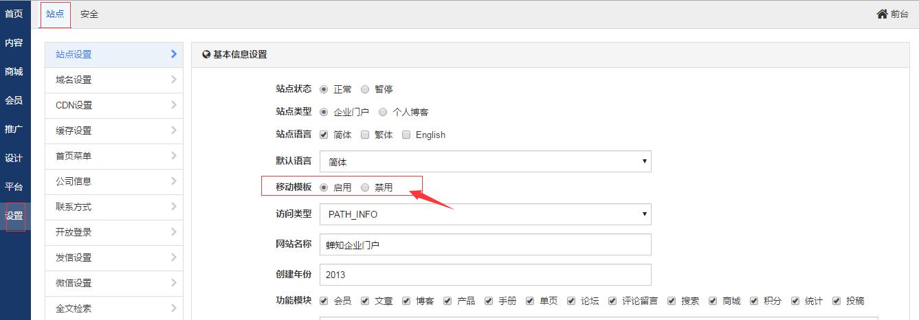2、如果设置了移动端的界面和布局,想要撤销,恢复为网页版的响应式布局页面,可以登录数据库,删掉eps_config表里面section='template' and `key` = 'mobile'的数据。新版本会添加开启和禁用功能。( 蝉知4.4.1版本已在后台→设置→站点设置里增加了移动模板的开启和禁用功能,可以到那进行操作。)