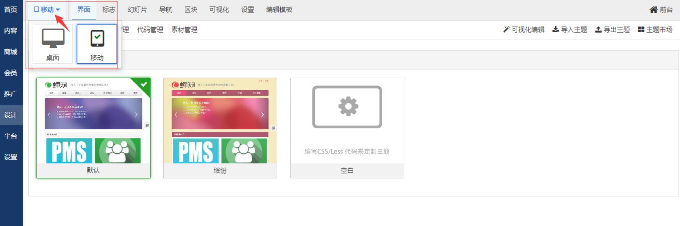 在移动模板设置里可以自定义手机模板,设置logo、小图标、幻灯片、区块、布局,可视化,管理手机端素材以及其他设置项。