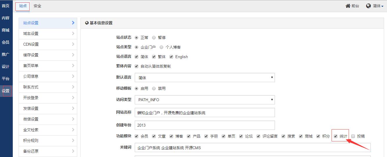 要使用流量统计功能,需要先到后台设置→站点→站点设置里勾选开通。