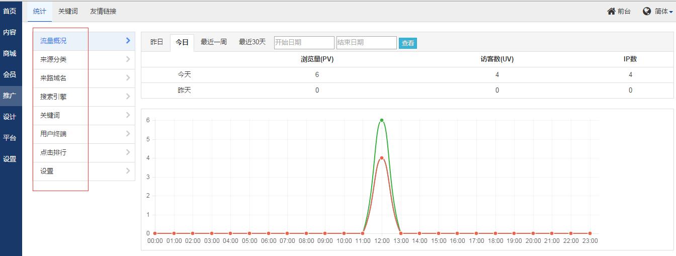 开通了流量统计功能后,就可以在后台推广--统计里可以查看到流量统计的数据。