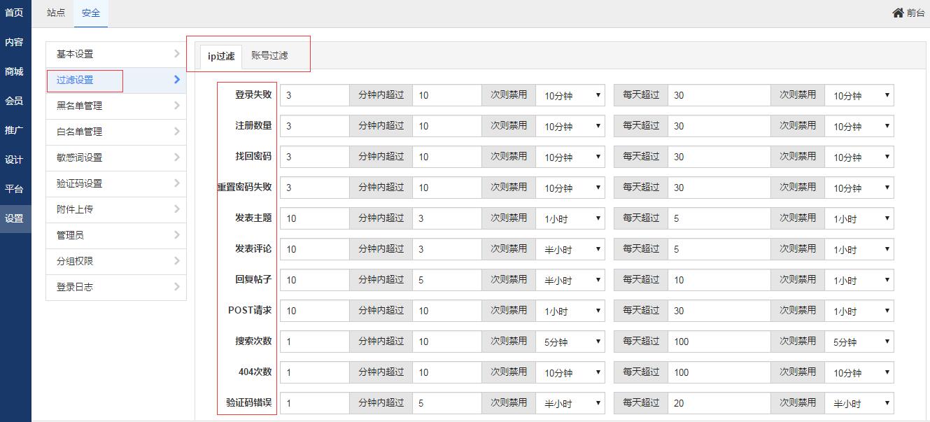 可以设置ip和帐号过滤。可以对某个ip/帐号的登录失败、注册数量、找回密码、重置密码失败、发表主题、发表评论、回复帖子、POST请求、搜索次数、404次数、验证码错误等的次数做限制。