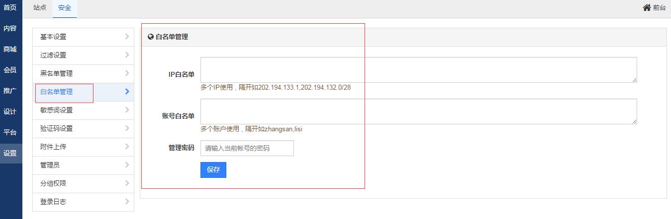 后台--安全里新增了过滤设置、黑名单管理和白名单管理。