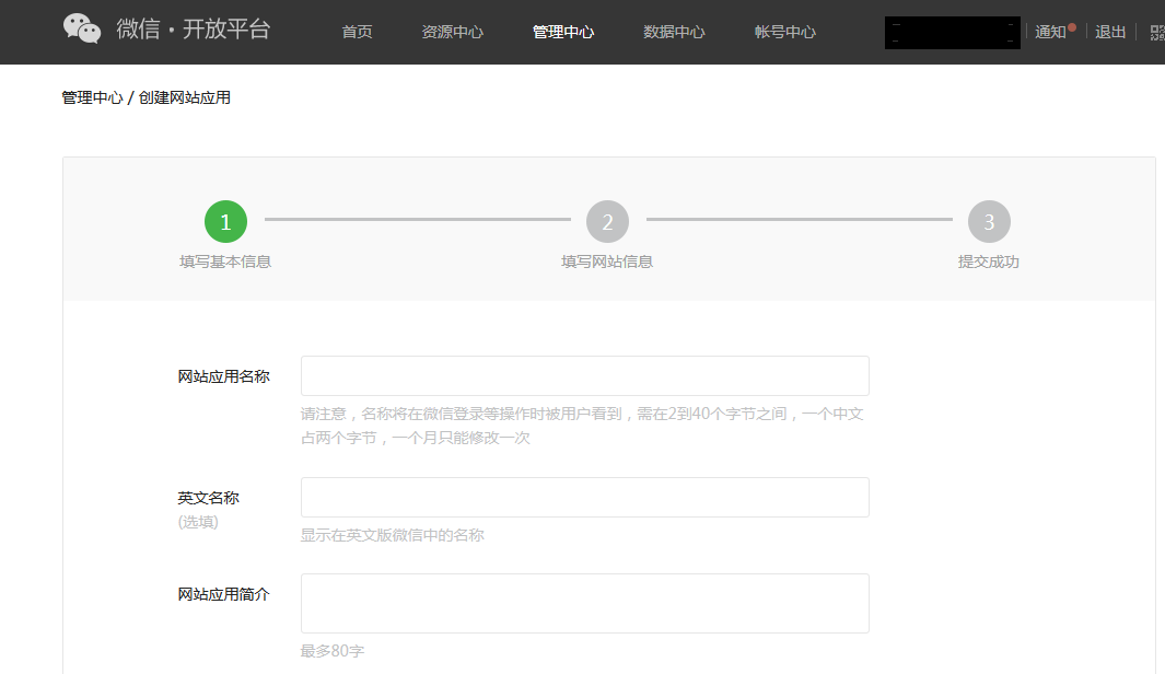 1. 注册微信开放平台帐号 ( open.weixin.qq.com ) , 在帐号中心中填写开发者资质认证申请,并等待认证通过。