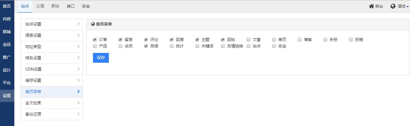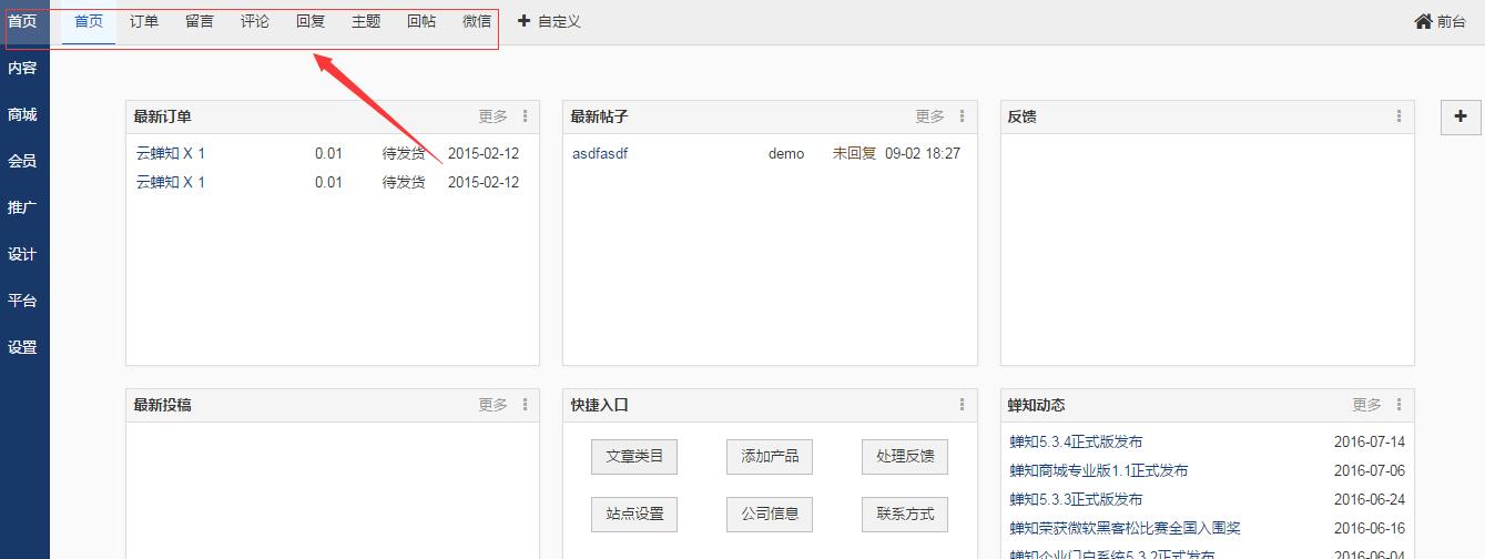 管理员可以自定义后台首页顶部导航。将常用的功能模块添加到首页导航,方便快捷的管理网站。