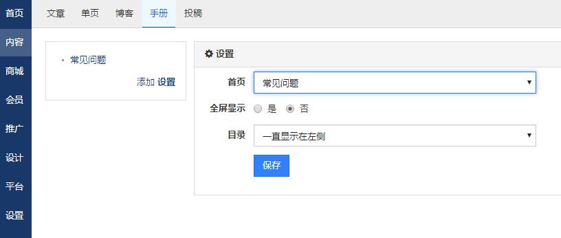 手册的设置页面可以管理手册页面的界面显示、手册的目录显示以及手册是否全屏显示等。