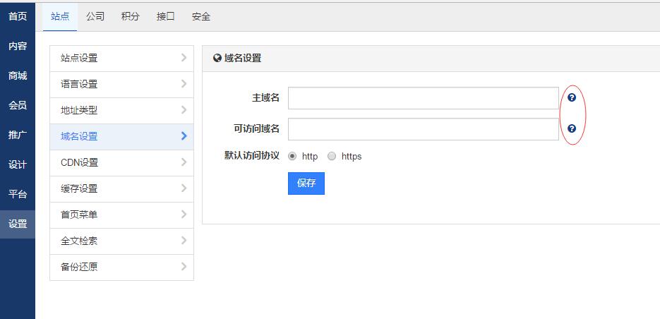 域名设置项可以添加主域名和可访问域名,以及切换默认访问协议。