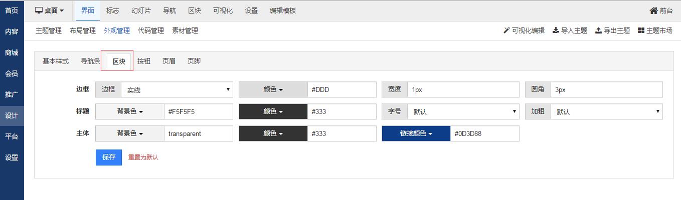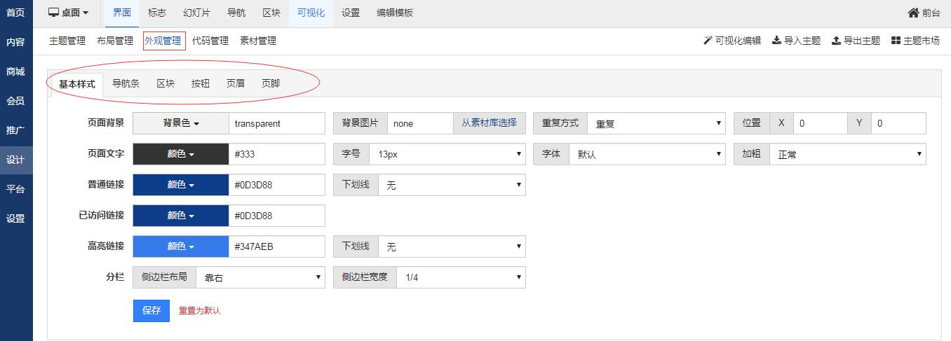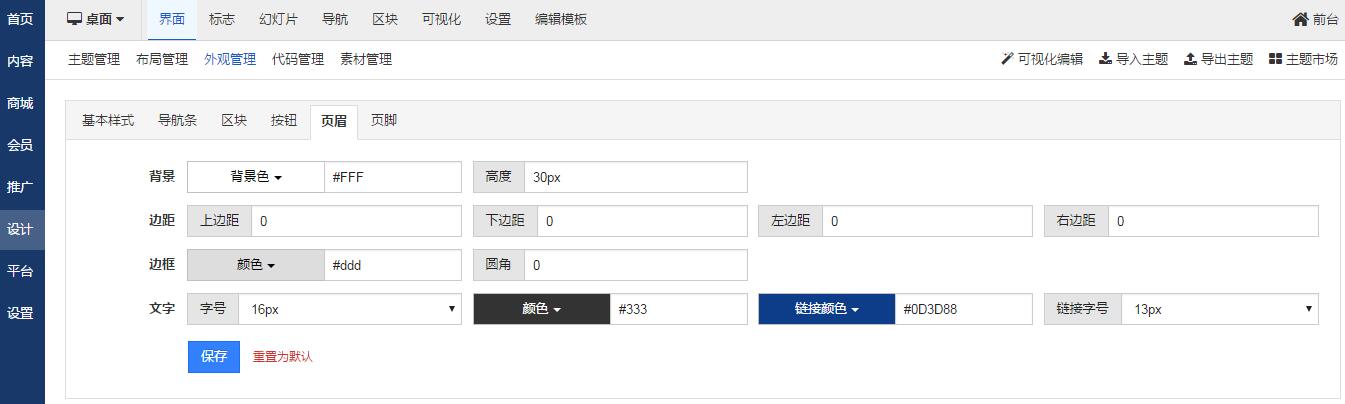后台设计→界面→外观管理即可点击进入自定义编辑页面,自定义你想要的参数,保存即可。(注:每个主题可自定义的选项是不一样的。)