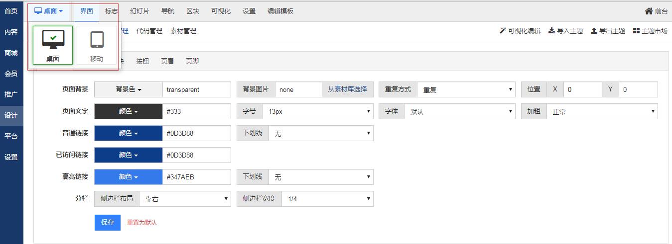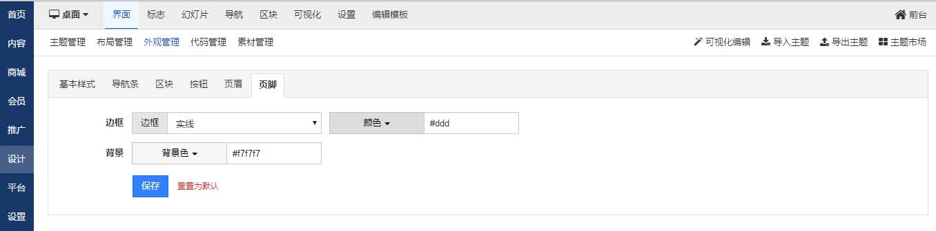 以蝉知默认主题风格为例,可以在后台设计→界面→主题管理里自定义基本样式、导航条、区块、按钮、页脚样式,也可以自己加CSS、JS代码。( 同样的自定义样式可以切换到移动端,只是需要提醒的是桌面端和移动端可自定义的项是有所区别的。移动端需要先到后台设置→基本设置里启用。)