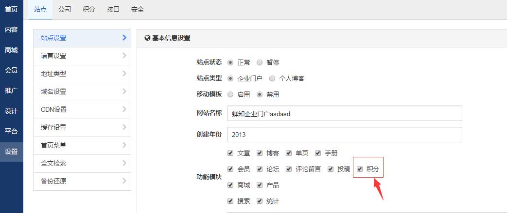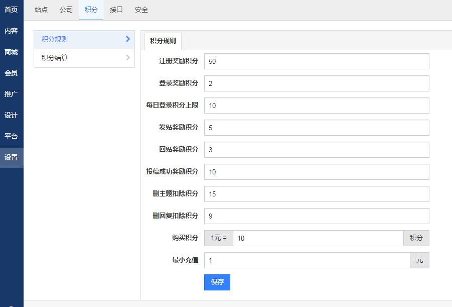 开通了积分功能后,可以在站点里设置积分规则了,系统给的是我们默认的积分规则,你可以根据实际需要做调整。