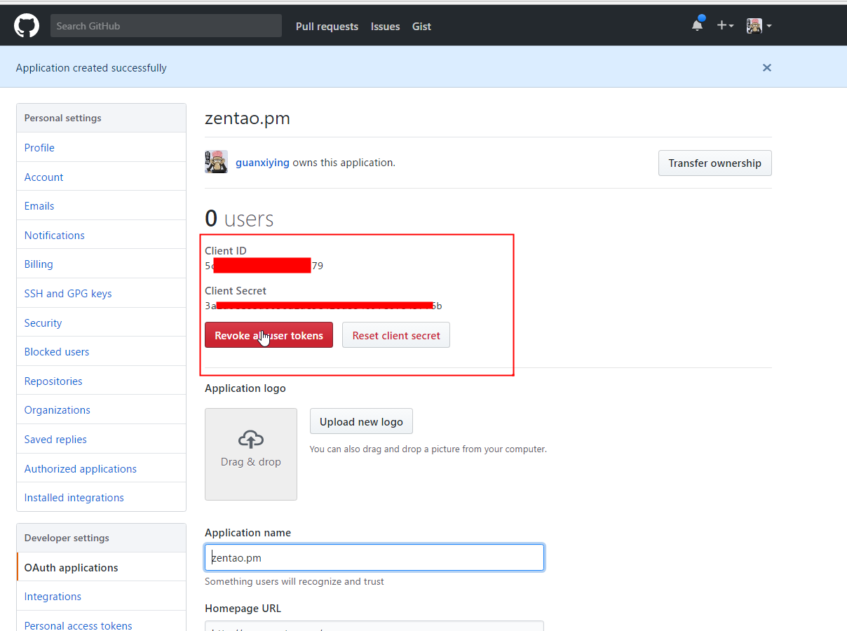 创建 applications 成功后 可从应用列表进入应用详情界面,在这个页面可以查看应用的 Client ID 跟Client Secret,注意:需要点击下图中的 Revoke all user tokens 按钮激活会员登录功能。