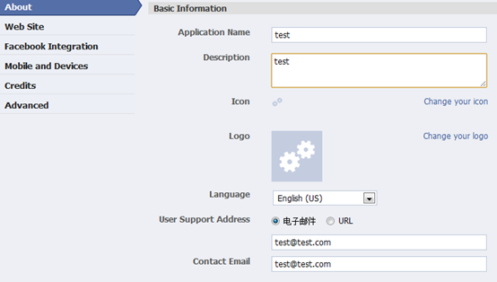 进入我的应用界面创建一个应用,网址:http://www.facebook.com/developers/apps.php