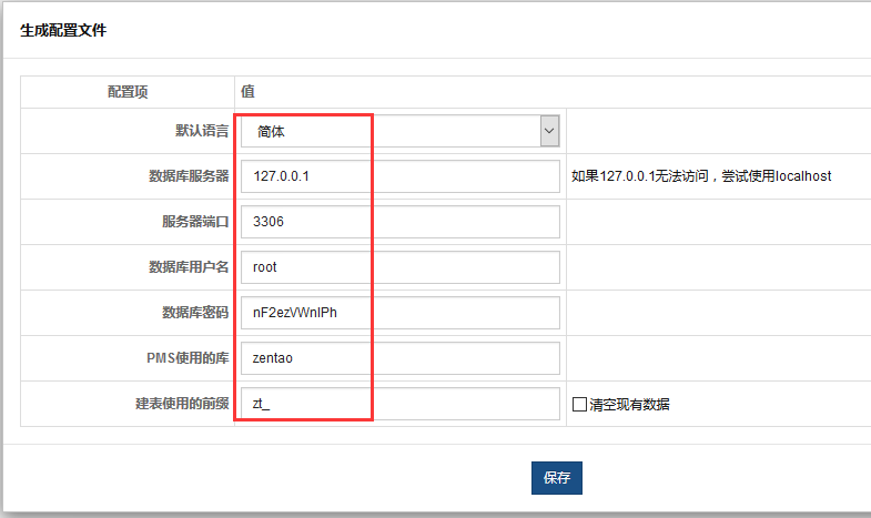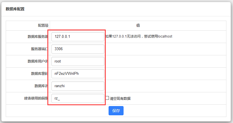 数据库名填写 ranzhi 。建表使用的前缀,可以自定义根据使用需要来写。
