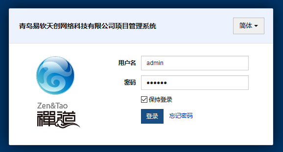 点击登录禅道管理系统按钮,输入刚才设置的管理员帐号密码,即可登录和使用禅道。