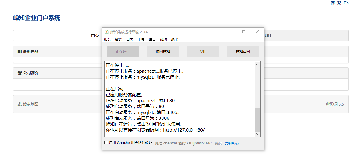 5、在蝉知集成运行控制面板里重启服务。(注意:修改配置后,必须重启服务,才生效。)