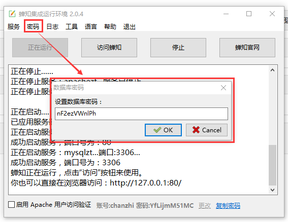 数据库密码请填写 蝉知集成运行控制面板里 密码--数据库密码。