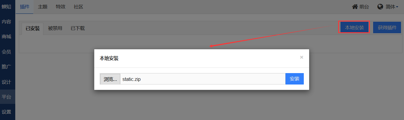 2、后台--平台--插件--本地安装,上传静态插件包。