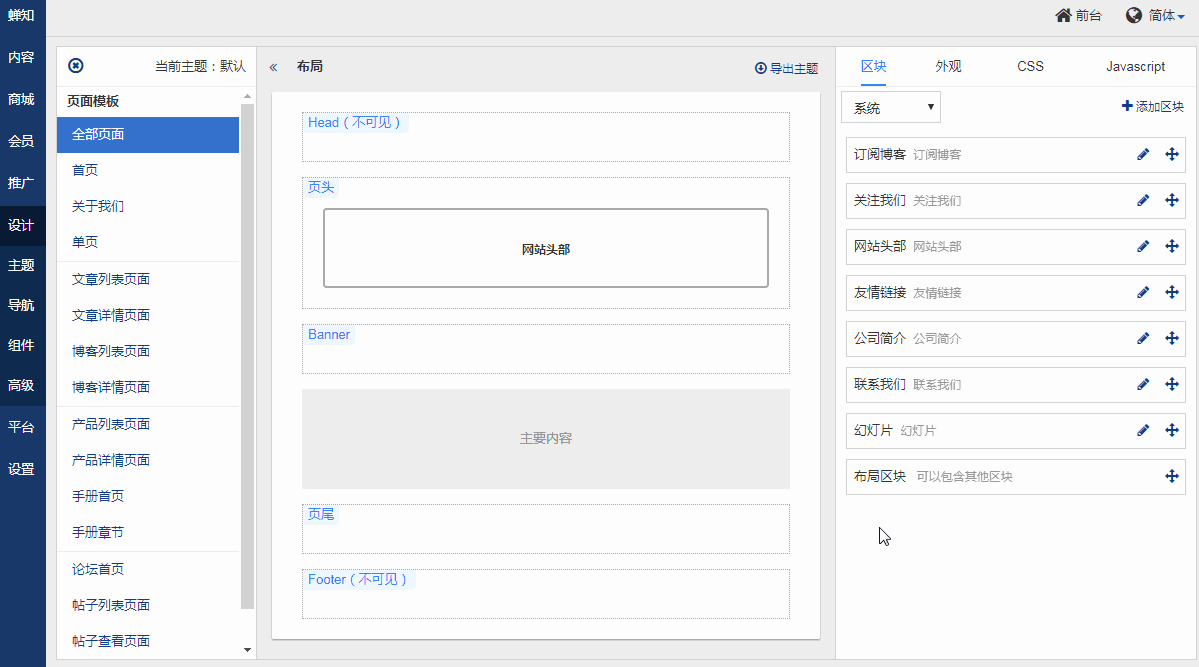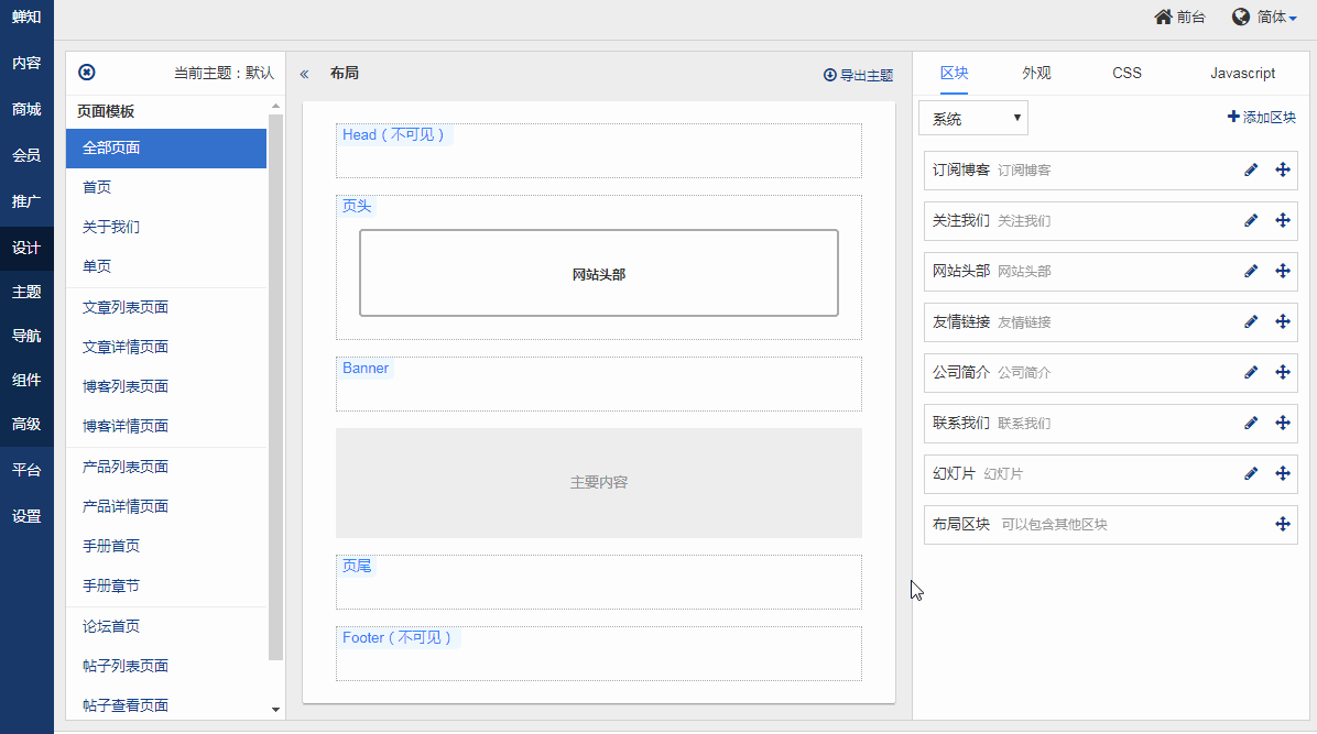 用户可以通过区块布局、外观管理、页面代码管理来自定义设计主题,并且可以将自己设计好的主题导出。