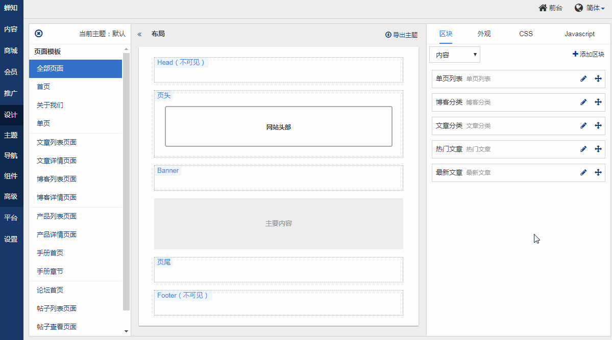 蝉知系统中几乎所有的页面都支持区块布局,除了上面所示常规模块的布局之外,具体到每一个文章、博文、单页、产品页面也可以进行单独的区块布局。有能力的用户也可灵活运用"单页+区块布局",设计出各种自己想要的页面,比如企业活动专题等。