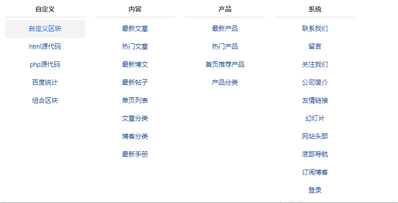 蝉知系统中,区块是页面构成的基本单位,也就是说蝉知网站页面是由一个个区块布局构成的。有了区块,用户就可以在指定页面的指定位置显示指定内容。除了系统提供的区块之外,用户还可以自定义区块内容。