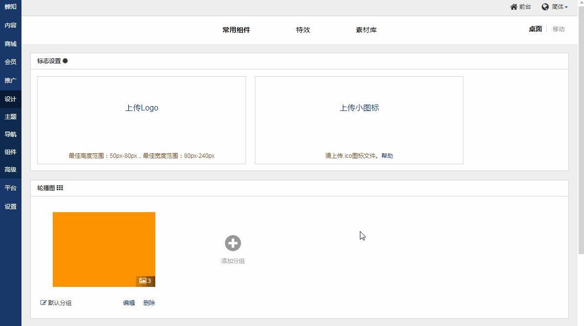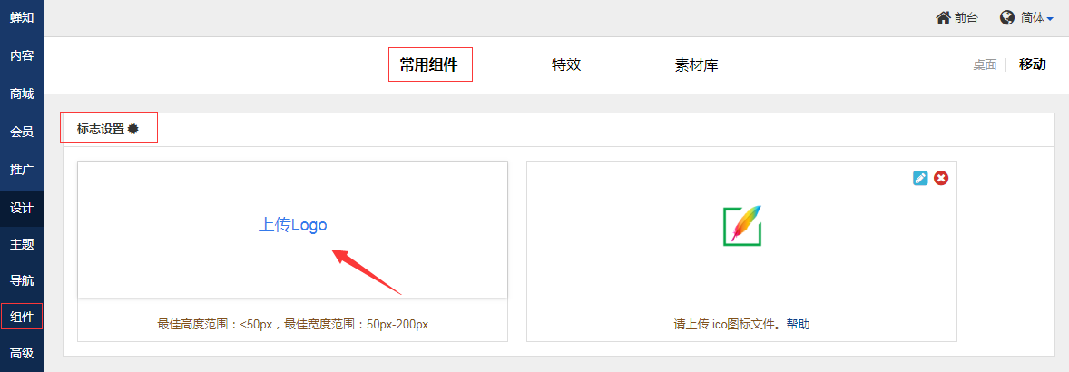 1. 使用管理员登录后台,进入设计→组件 →常用组件→标志设置。