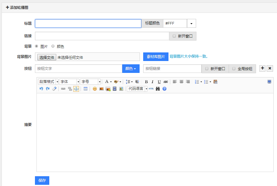 填写好轮播图 内容,可以上传图片也可以设置背景颜色。勾选了全局按钮的话,该按钮在前台显示的每张轮播图 上都会显示。