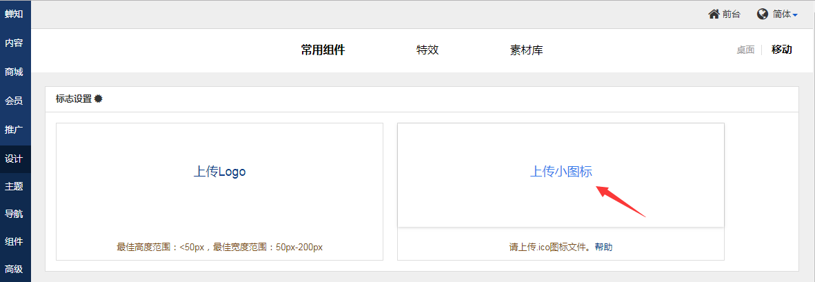 在蝉知后台设置站点图标很方便, 设计→组件 →常用组件→ 标志设置里面上传图标ico文件即可。