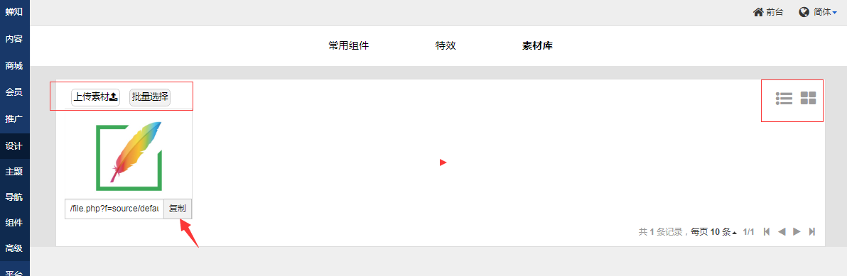 2、点击右上角的上传素材可以直接上传你的图片。还可以切换素材的显示样式。