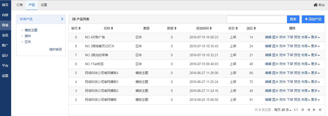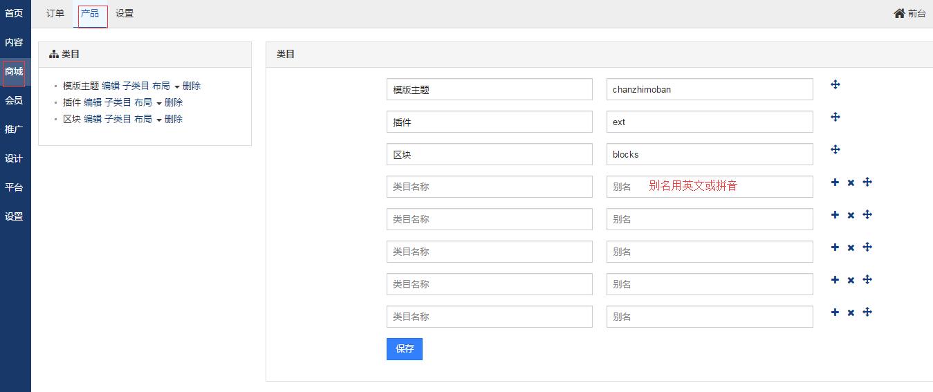 和文章管理相同,在维护产品之前,需要先维护产品的类目信息。
