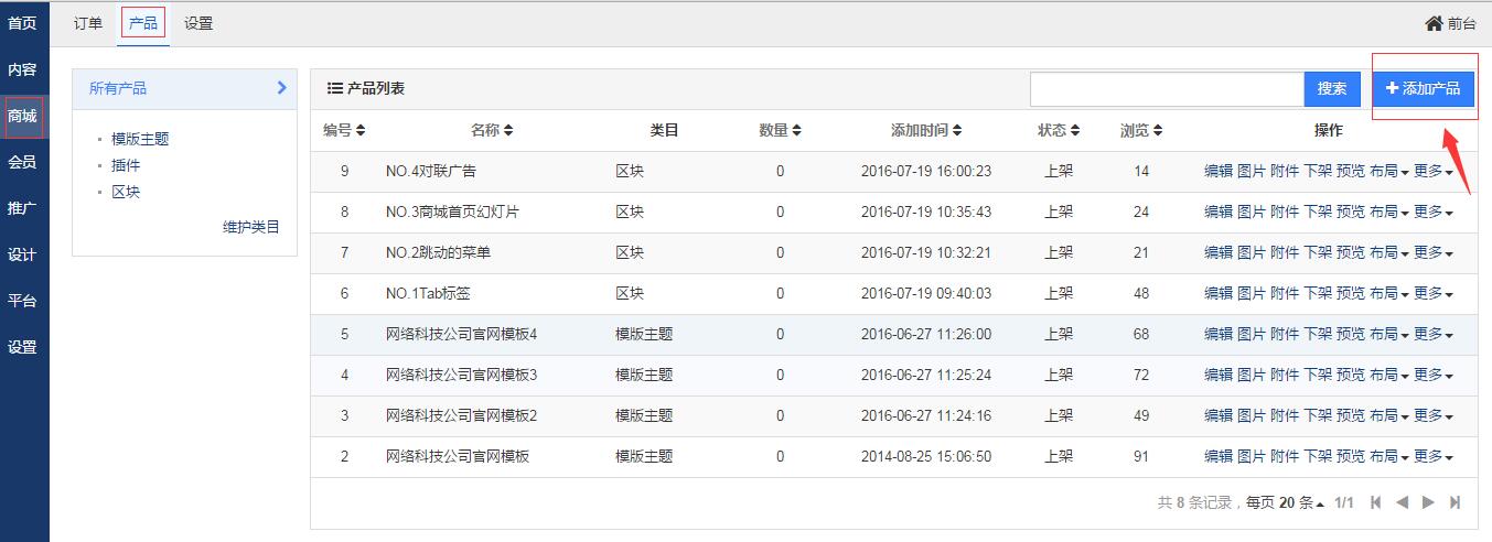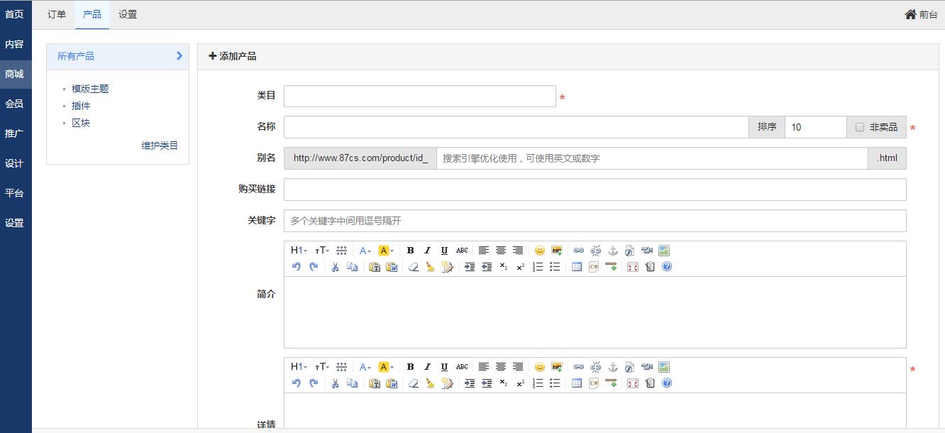 使用管理员登录后台之后,进入产品发布页面,就可以添加产品了: