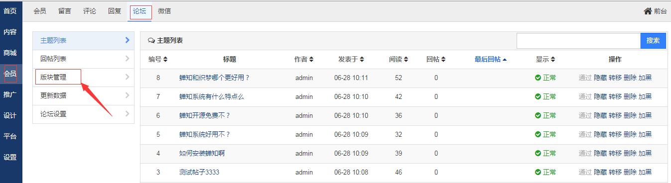 使用管理员登录蝉知管理后台,进入论坛模块。