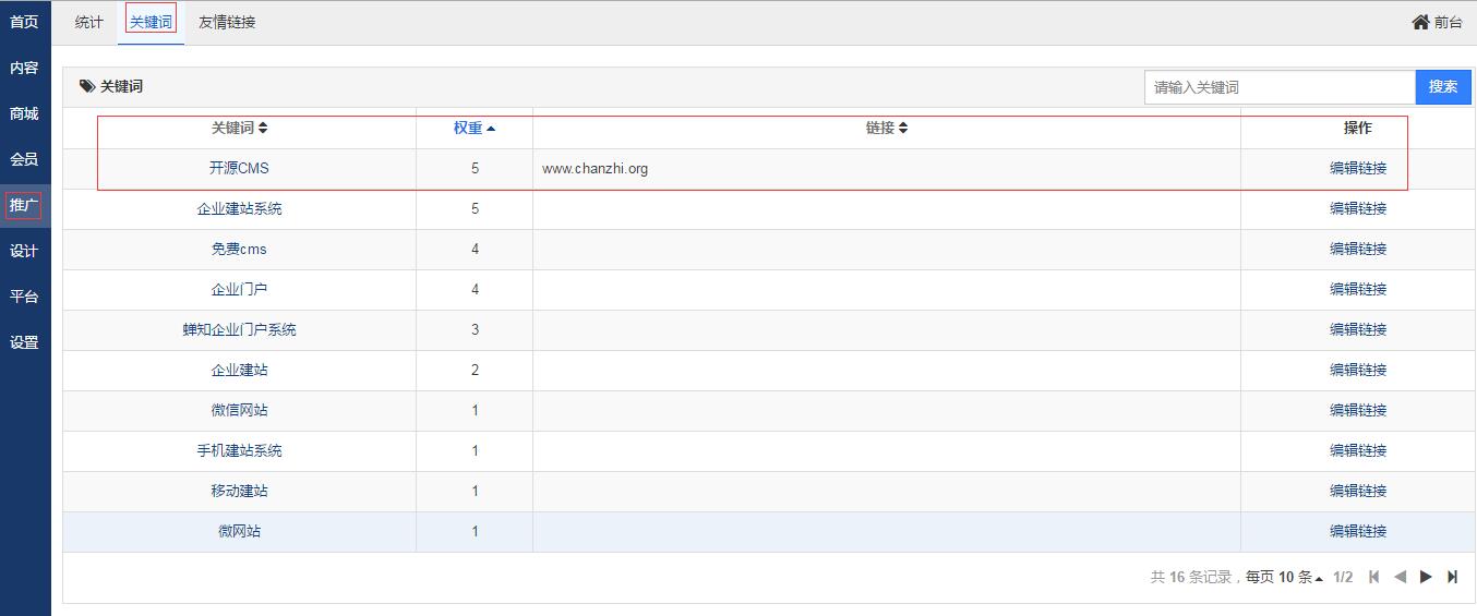 蝉知系统在每个模块几乎都有关键词可以设置。为了更好的管理维护关键词,我们在站点模块下面单独设置了一个关键词管理模块。通过这个关键词管理模块,您可以非常方便的了解到系统中有多少关键词,每个关键词的权重如何,同时还可以设置每个关键词的链接。系统在前台显示的时候,如果文章中有这个关键词,会把相应的关键词替换成对应的链接。