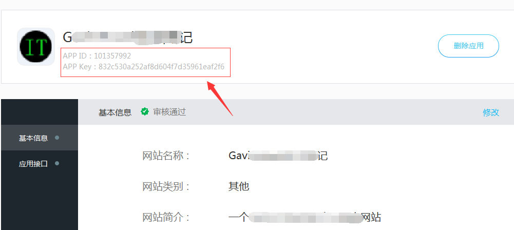 添加网站之后,系统为每一个网站分为一个appid和appkey,将这些信息拷贝到上图中的app key和app secret中。