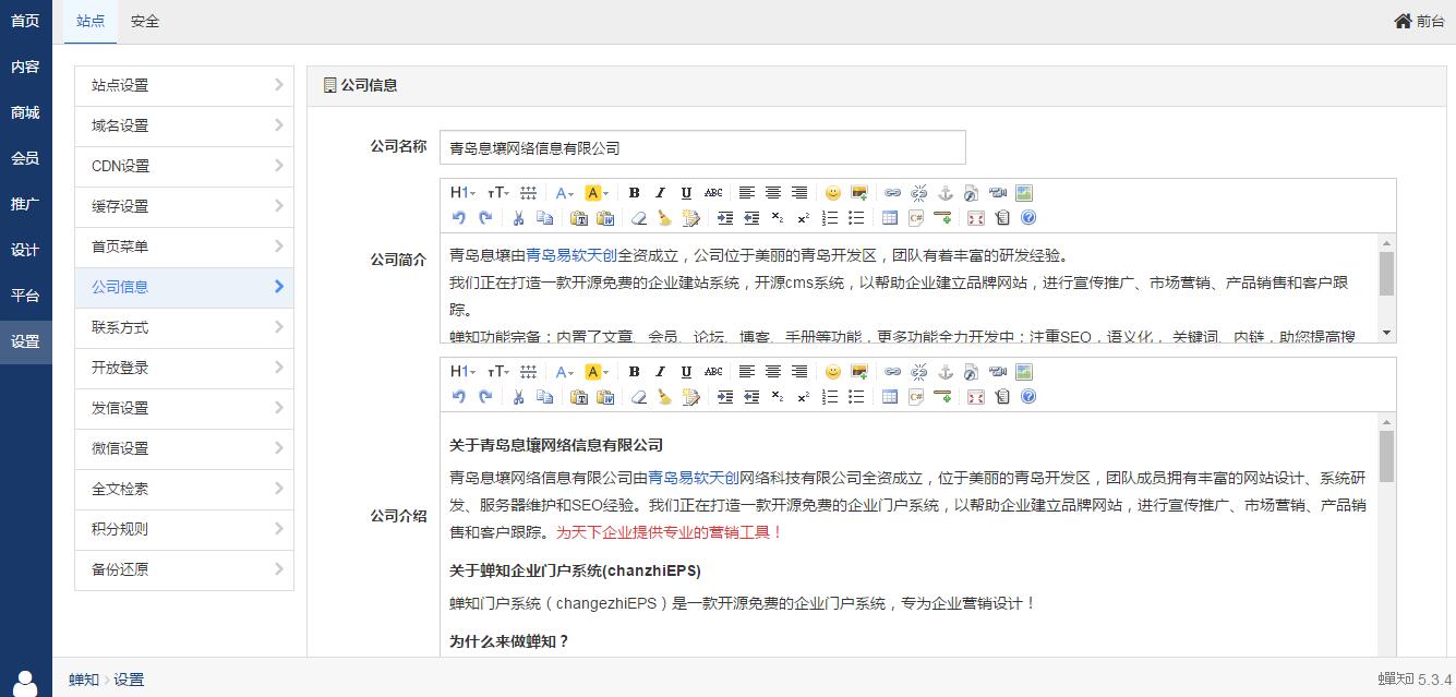公司的基本信息在前台以“关于我们”的栏目出现,设置基本的公司信息,方便用户联系到公司: