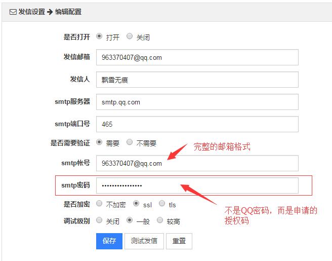 2、输入邮件的smtp密码等信息,这里以QQ邮箱为例,先开启QQ邮箱的smtp服务,需要注意的是smtp服务器要与你用的邮箱相对应,比如你用QQ邮箱则需将smtp服务器设置为smtp.qq.com,还要特别注意的是密码框里输入的不是QQ密码,而是申请的授权码, 点击 保存 按钮