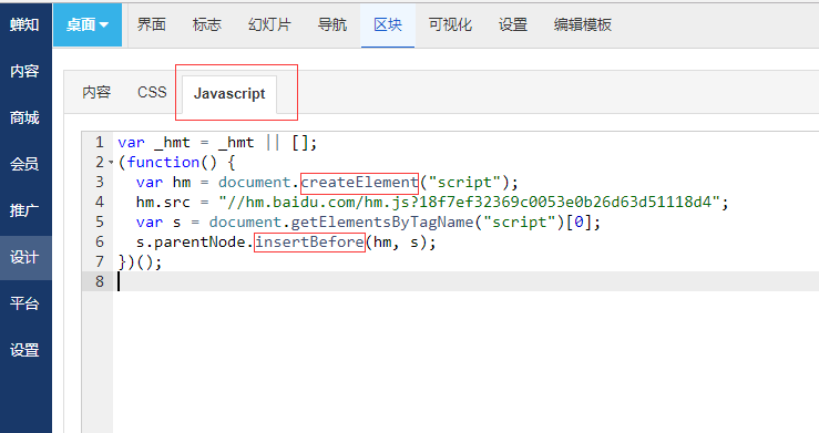 注:添加保存后,建议重新进入区块JS框中检查一下,因为出于安全考虑, 蝉知系统对一些代码关键字做了过滤处理,所以如果检查代码时出现关键字变化(如空格间隔、大小写等),可以把代码换个位置存放。