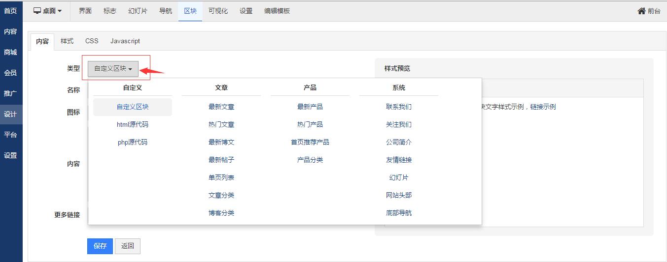 注:在某一个风格主题里添加和编辑的区块,只在本风格主题里生效。