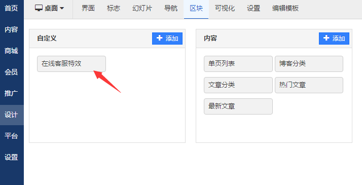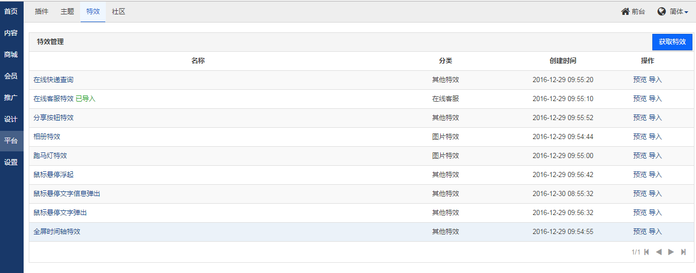 绑定登录成功之后,我们可以获取特效了,选择中意的特效,点击获取,即可在后台的特效列表中查看到,在特效中根据自己的需求设置参数属性,然后在特效管理列表中点导入按钮,系统会将特效整理成一个自定义区块自动放在区块列表里,用户只需要将该区块布局到要显示的页面中即可。