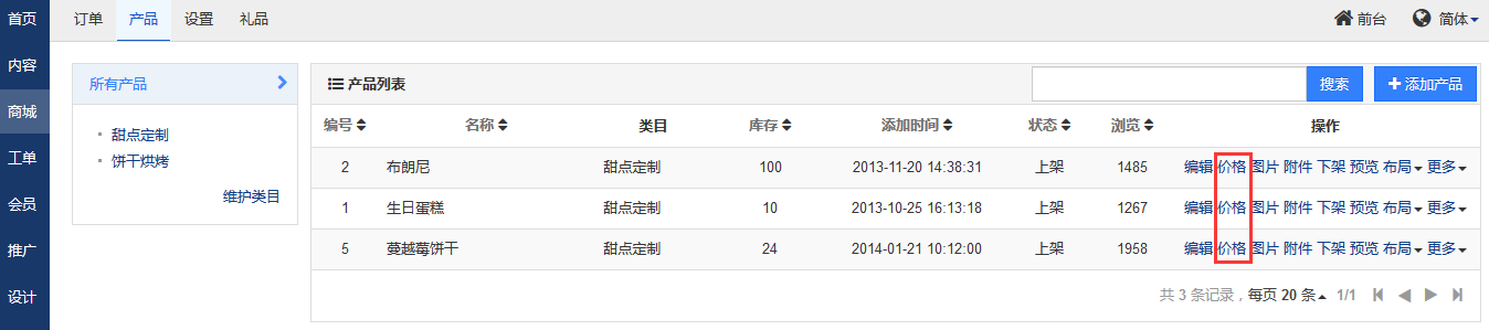 1、在产品列表页面,右侧的操作按钮里找到 价格 ,点击即可进入价格设置页面。
