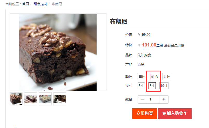 比如说布朗尼8寸,蓝色的价格是101,那么这个价格是 布朗尼这个产品特价价格(79.00)+蓝色调整值(2.00)+8寸调整值(20.00)。