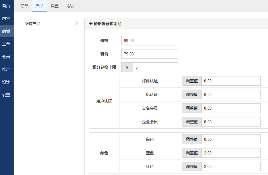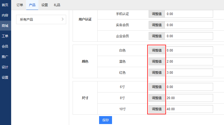 注意,这个页面填写的是调整值,而不是该产品属性的价格。