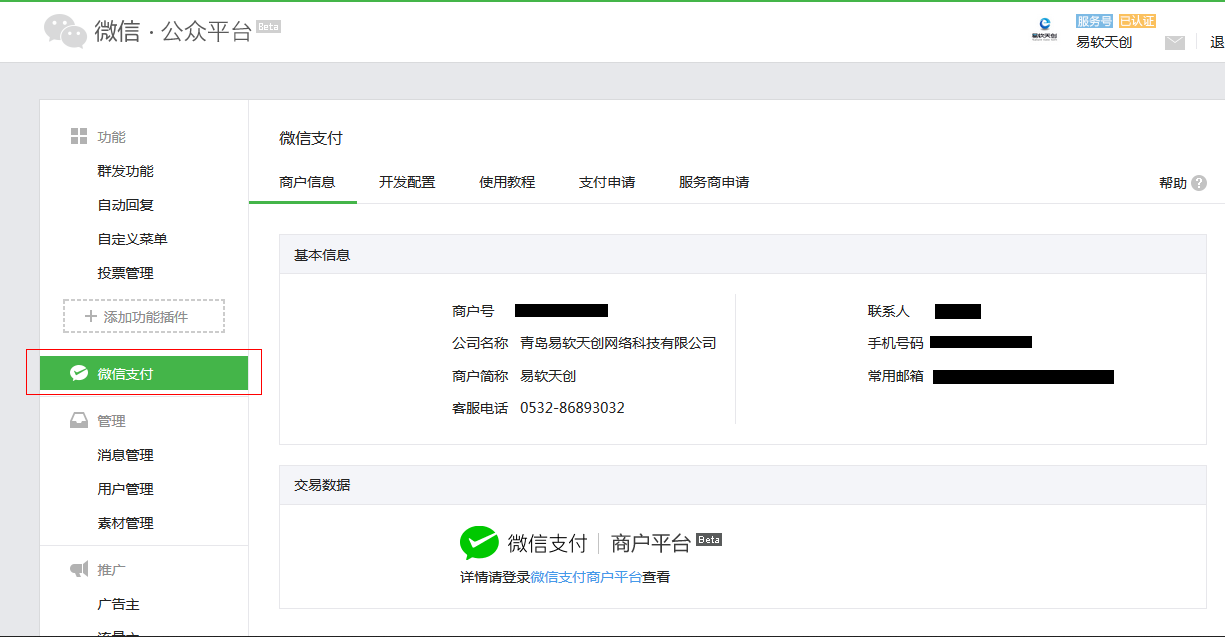 2. 申请微信支付,登录微信公众平台,微信支付—开通,提交资料申请微信支付,申请成功,商户号以及密码会发送到您的邮箱。参考: https://pay.weixin.qq.com/wiki/doc/api/jsapi.php?chapter=3_1
