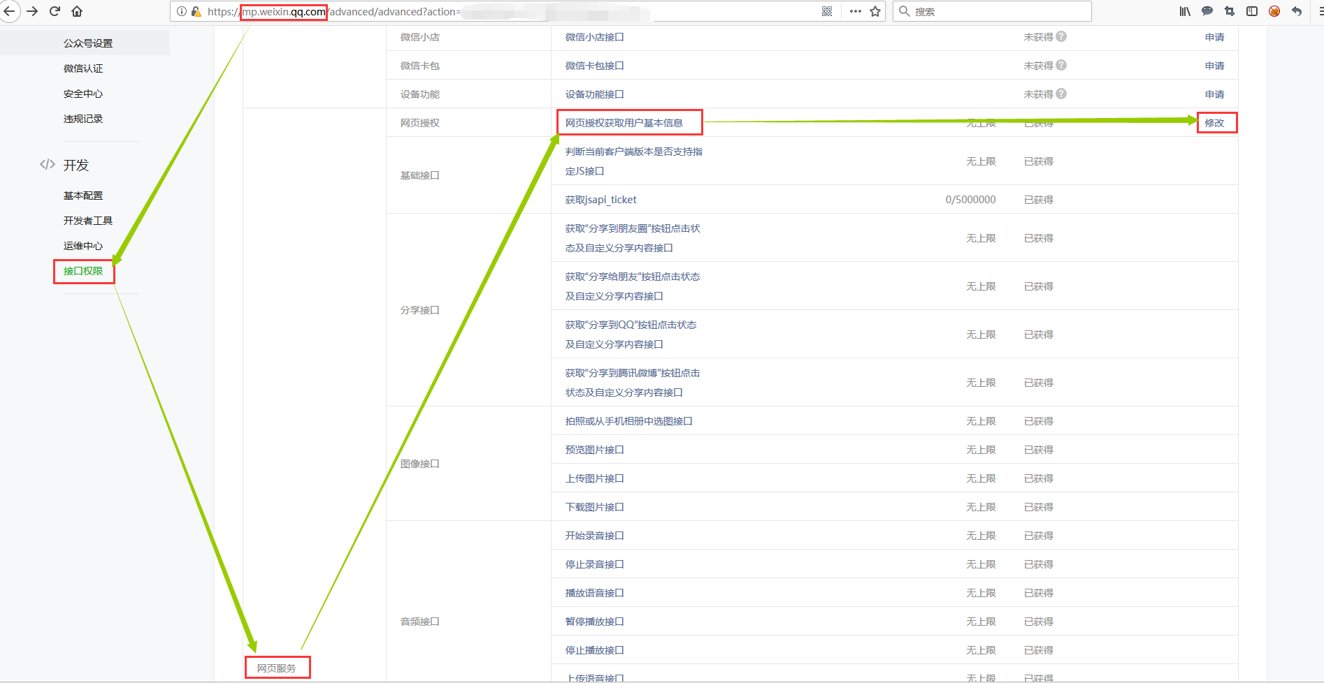 5. 设置网页授权获取用户基本信息的回调页面域名:公众平台-开发-接口权限