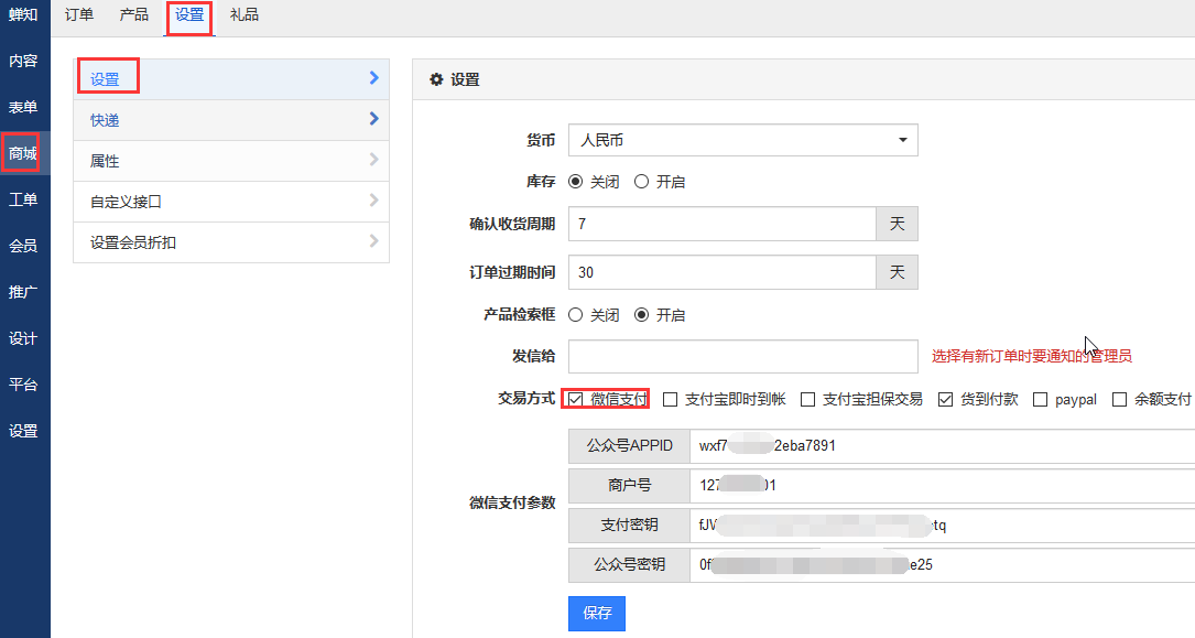 7、后台--商城--设置 启用微信支付并填写相应参数,
