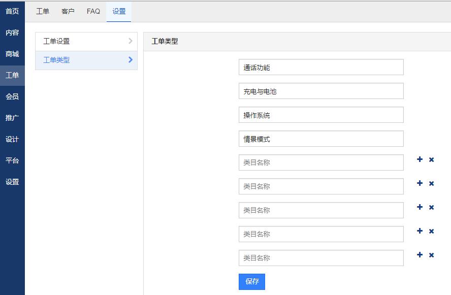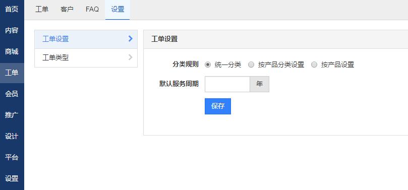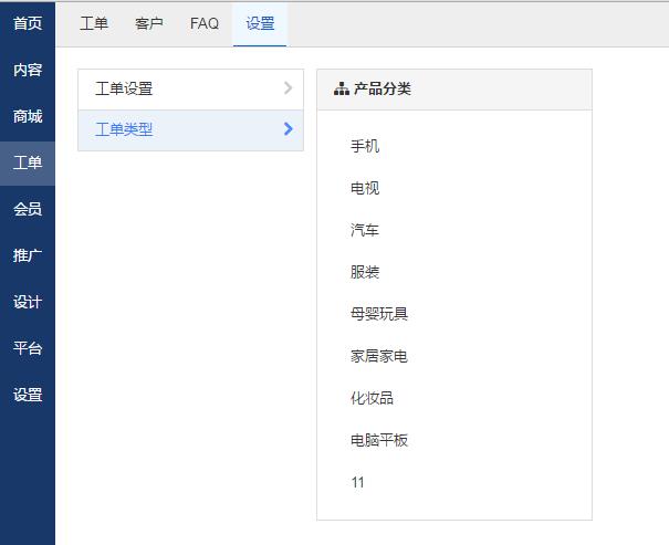 后台工单设置页面主要是为了给工单进行分类,分类有3种: