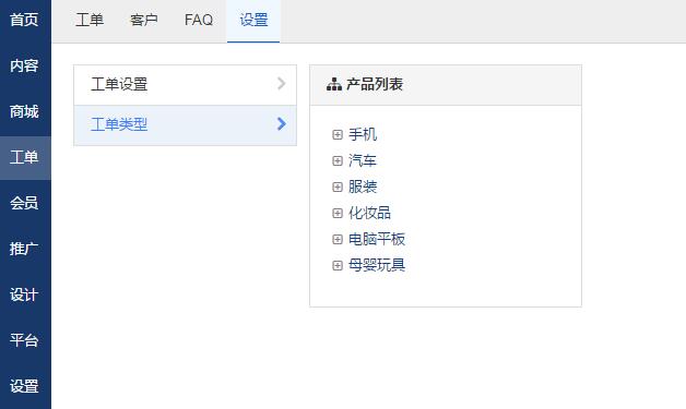 按产品分类设置:即按照后台产品类目设置进行工单分类;